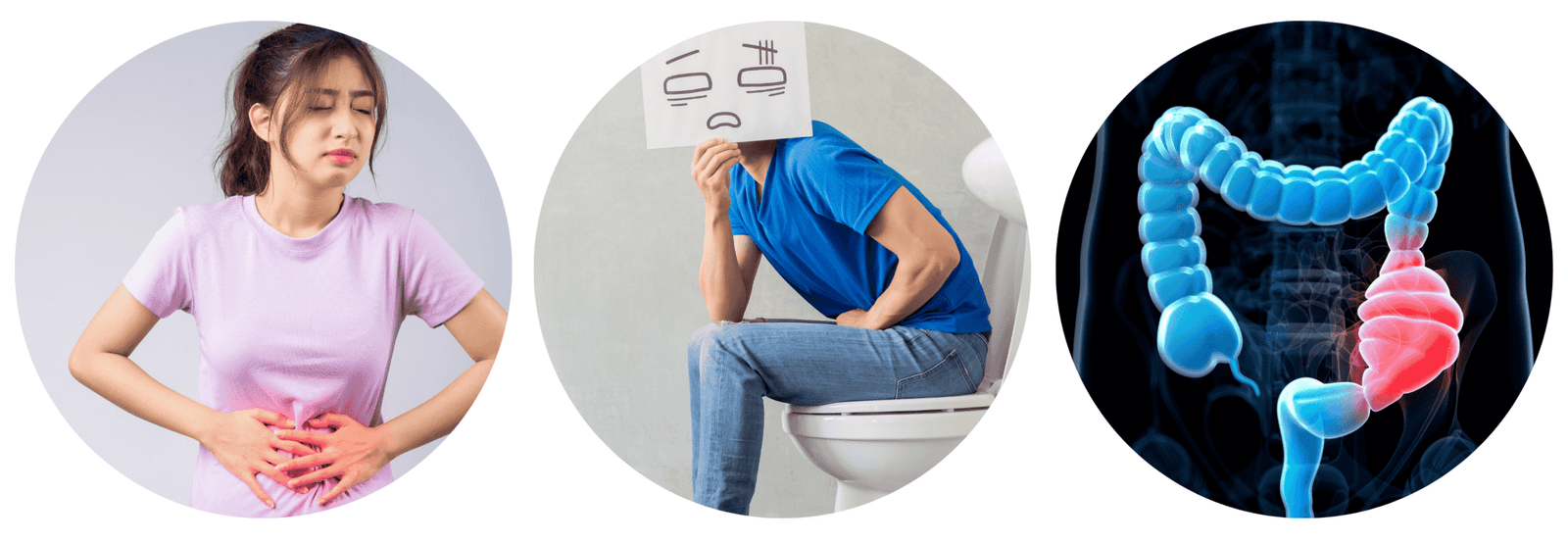 Zu den Hauptsymptomen zählen seltener Stuhlgang, harter oder klumpiger Stuhl, Völlegefühl, Blähungen, Bauchschmerzen und das Gefühl, „nicht fertig“ zu sein. Auch Reizbarkeit und Appetitlosigkeit können auftreten.